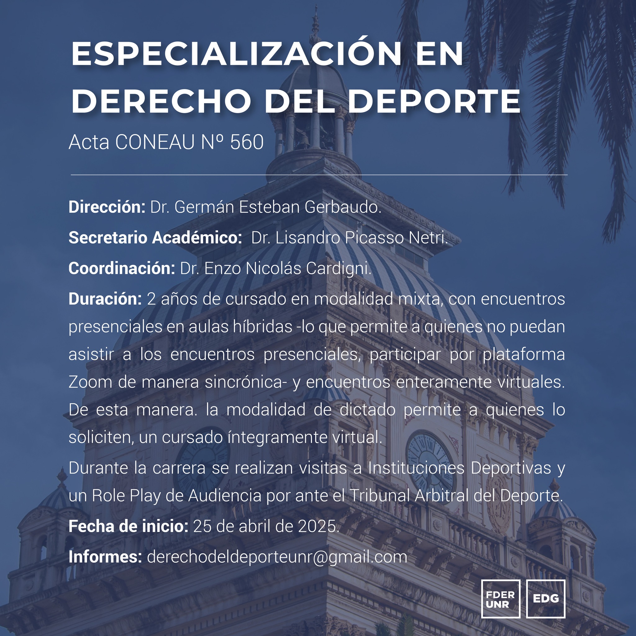 Todo lo expuesto y atendiendo especialmente a la importancia actual del Derecho del Deporte como rama jurídica transversal, y en particular, al desarrollo que desde la creación de la cátedra de Derecho del Deporte en el año 2015 los estudios de esta disciplina tienen en el ámbito de la Facultad de Derecho de la Universidad Nacional de Rosario, justifican la necesidad de seguir profundizando a través de una carrera de posgrado de Especialización el estudio del Derecho del Deporte.